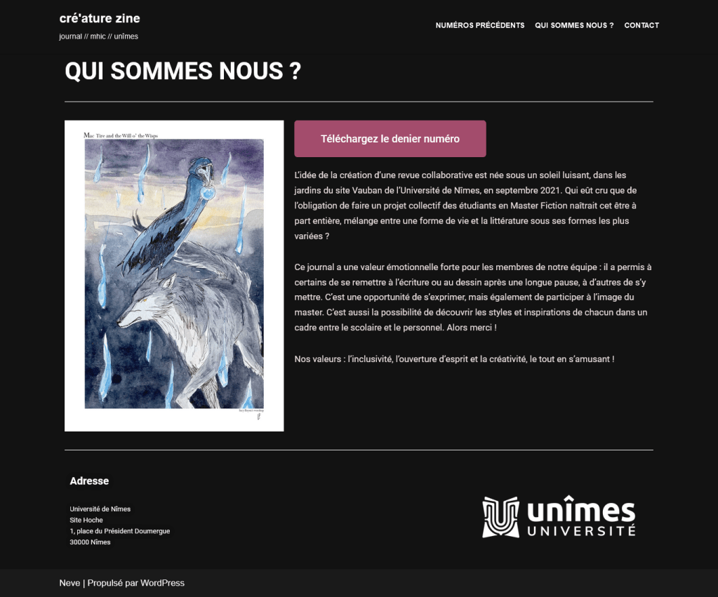 I designed two student magazines during my university studies in France. I’m very comfortable with Canva, InDesign and Photoshop. I also did modelling courses in web design in WordPress for my masters. See also some wireframes and some model pages on Figma.